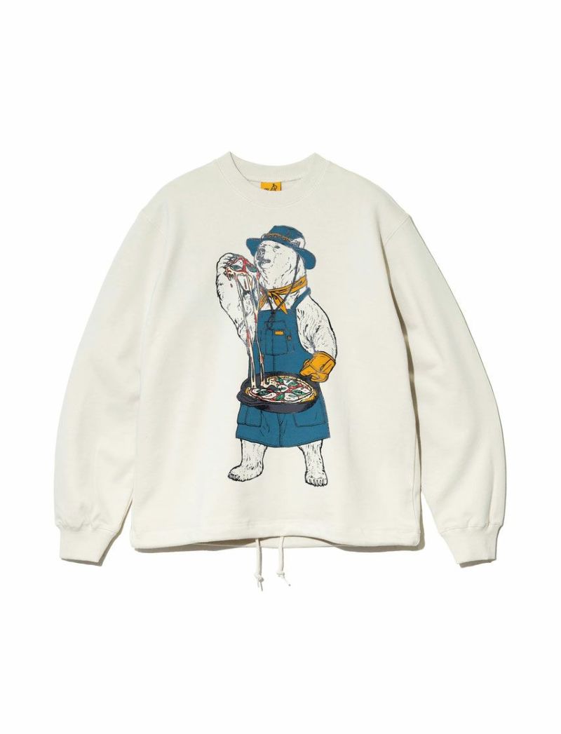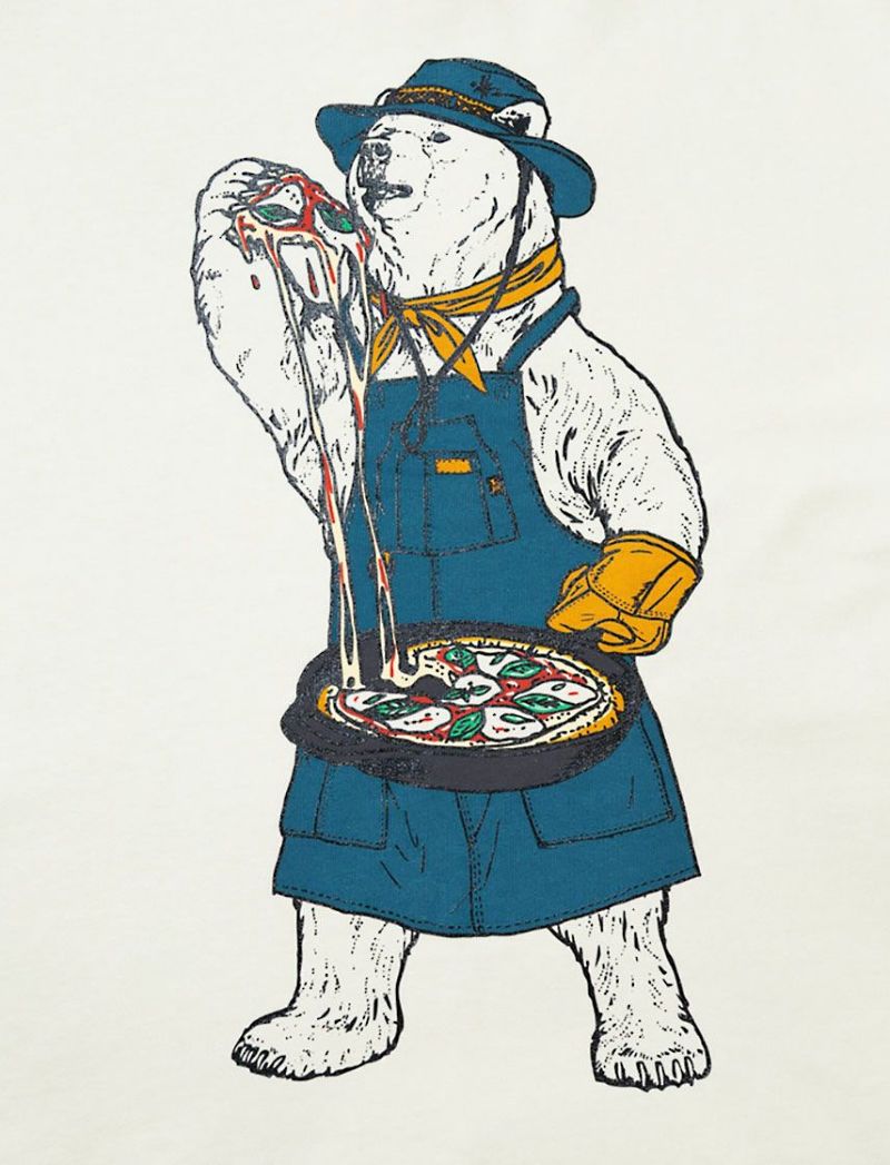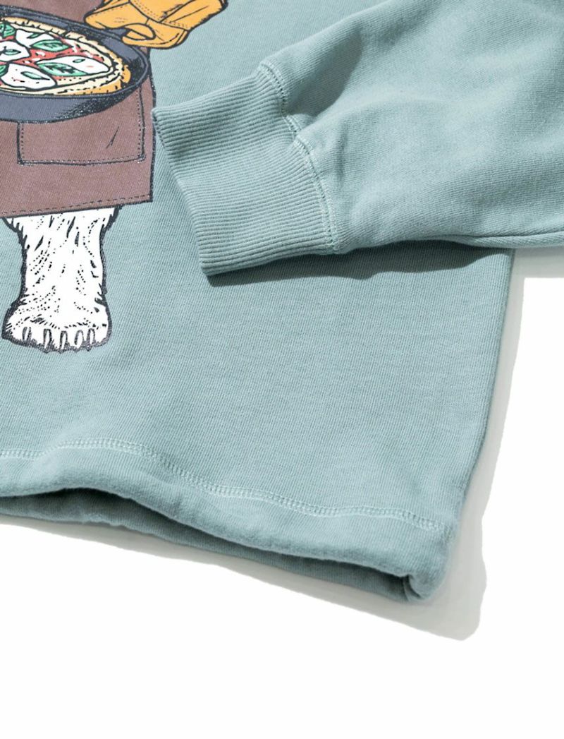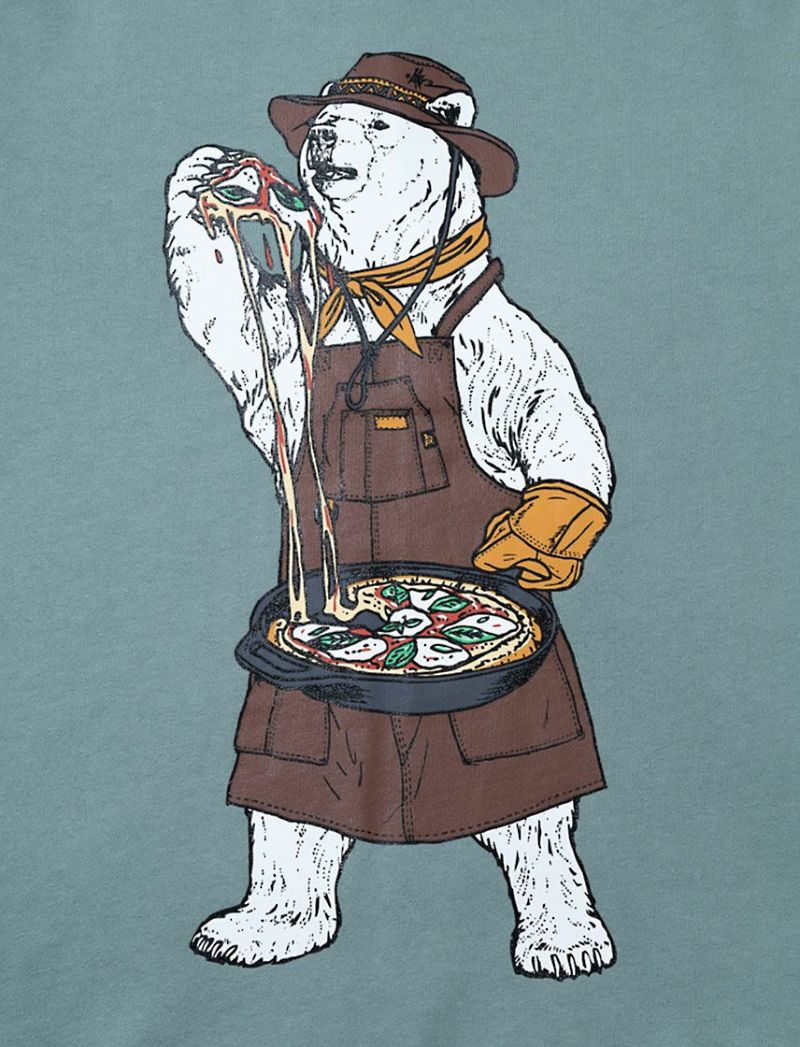 フロントには、スキレットで焼いたアツアツのピザを頬張る“キャンパークマ”をプリント。黒インク部分にはジェルプリントを重ね、立体感のある多色ラバープリントで仕上げています。遊び心と存在感を兼ね備えた1枚です。
