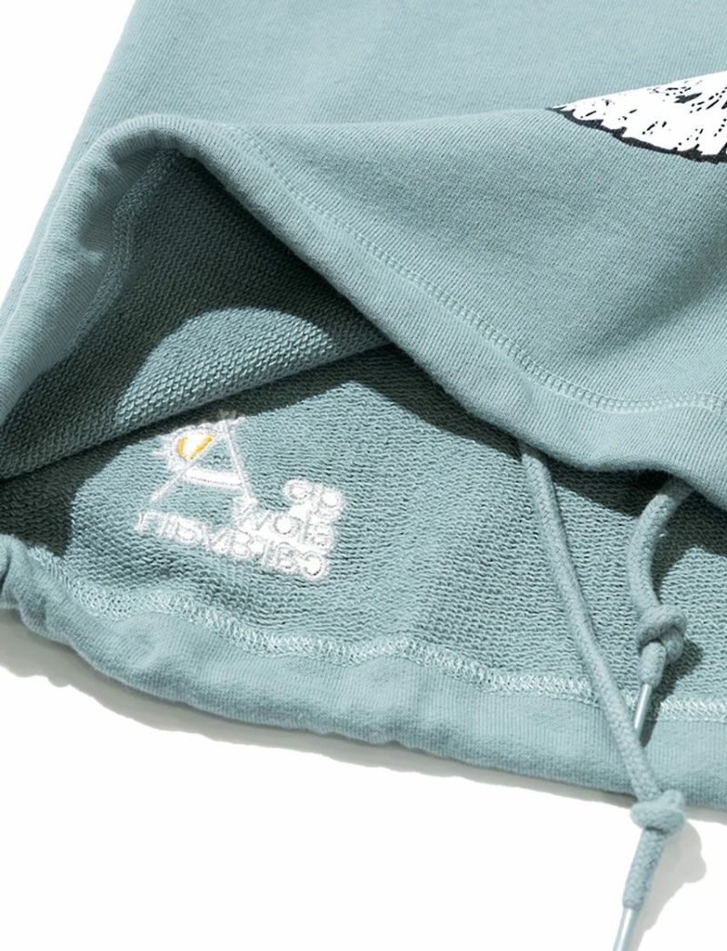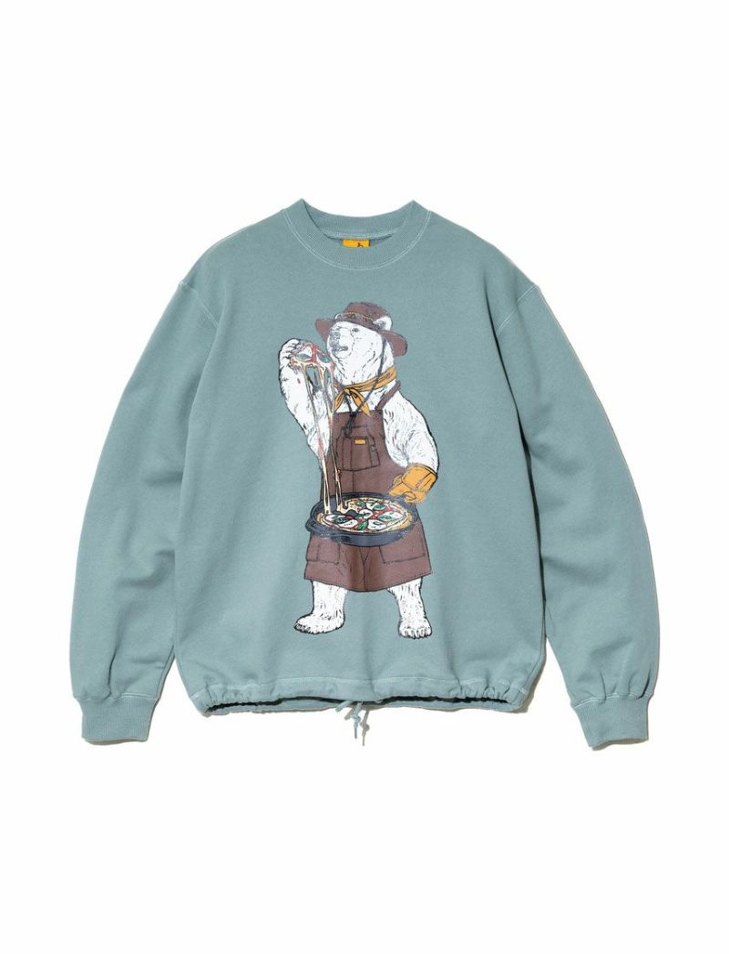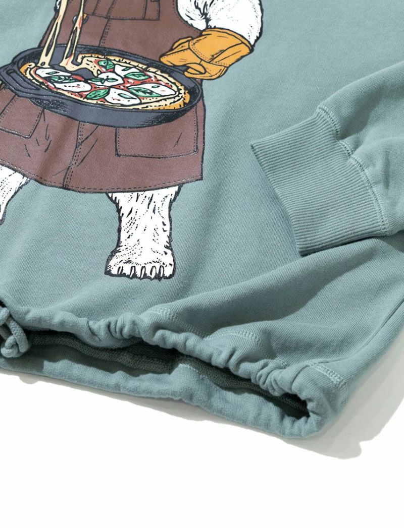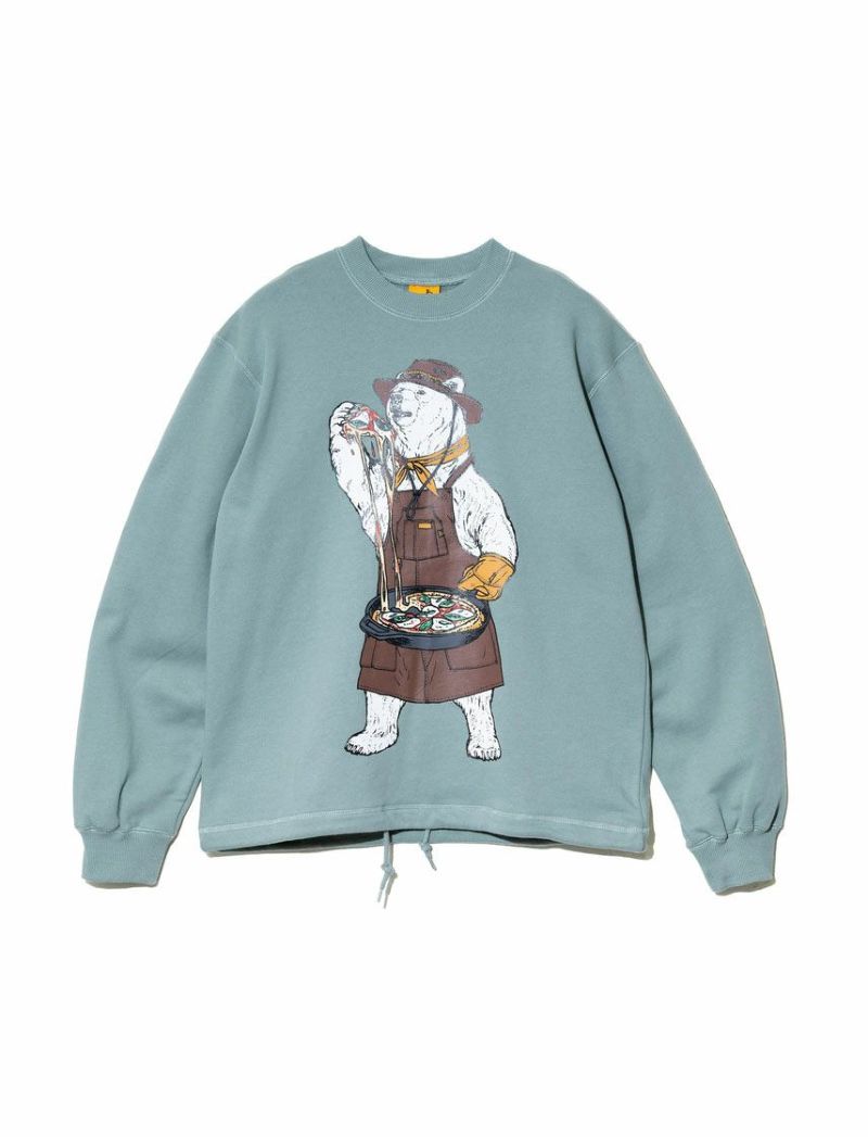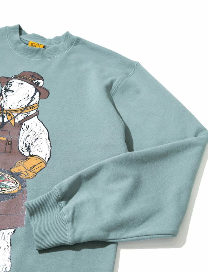 フロントには、スキレットで焼いたアツアツのピザを頬張る“キャンパークマ”をプリント。黒インク部分にはジェルプリントを重ね、立体感のある多色ラバープリントで仕上げています。遊び心と存在感を兼ね備えた1枚です。