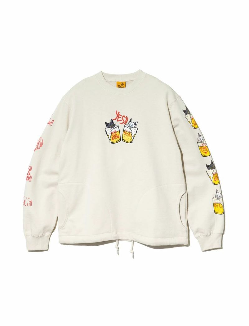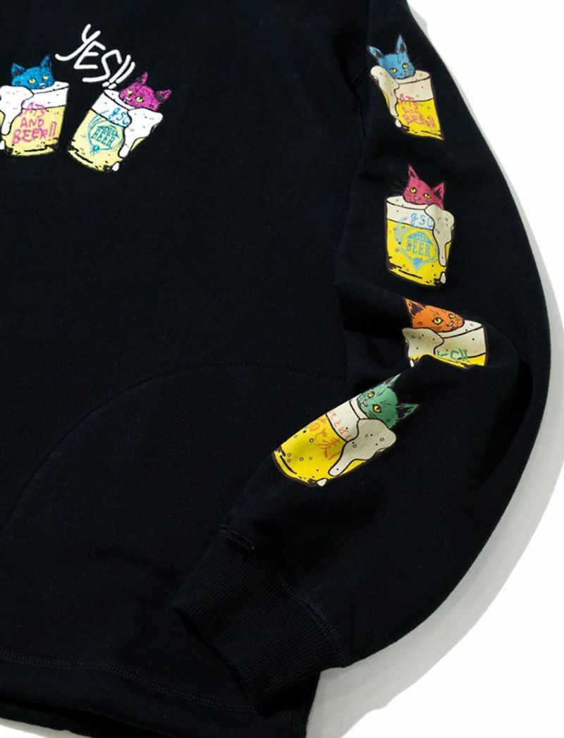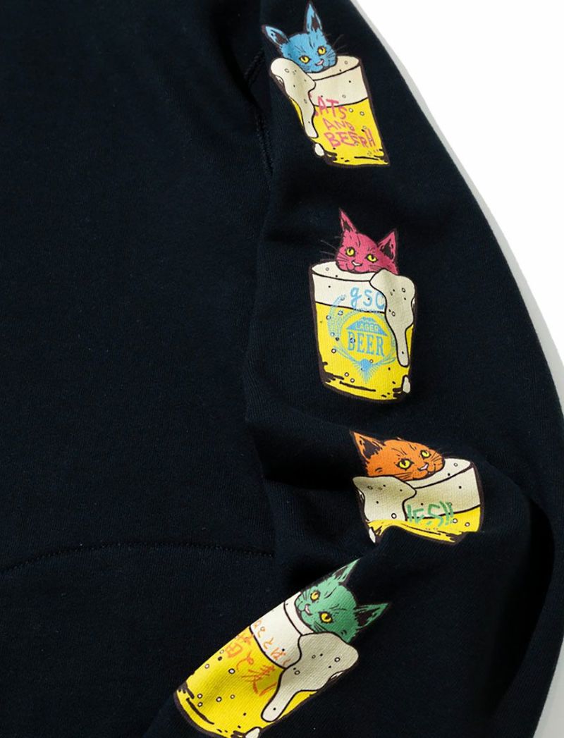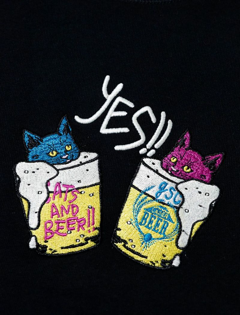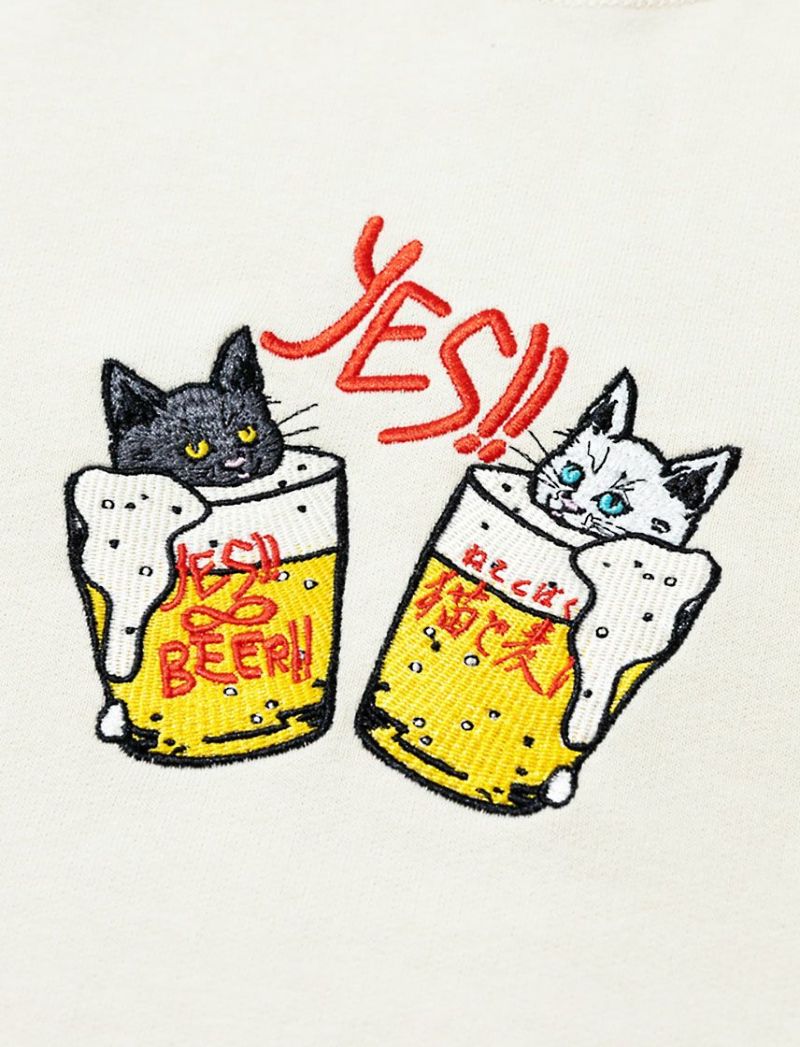 前身頃にはボディカラーごとに異なる猫と麦酒の刺繍をオン。袖には愛嬌たっぷりの“猫と麦酒”プリントを施し、シリーズらしい遊び心を効かせた1枚です。