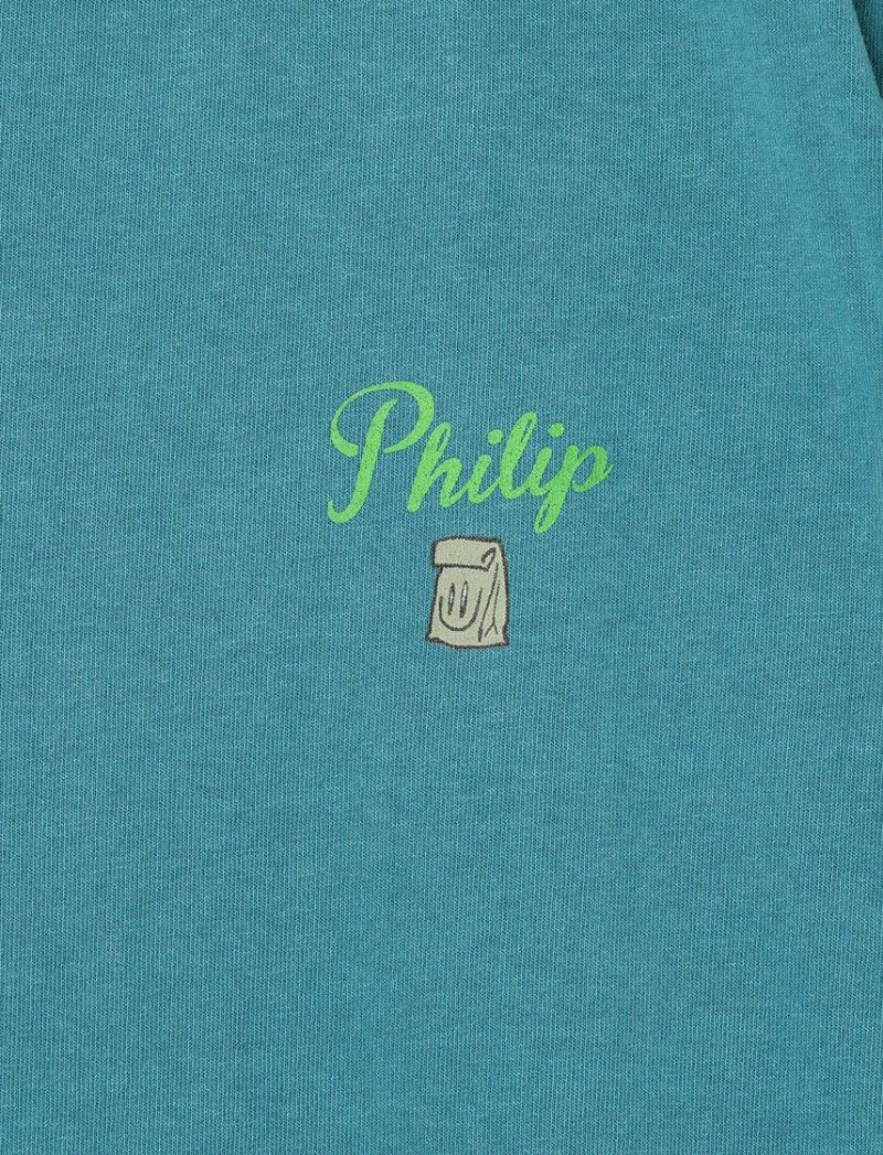 バックにはLunch Bagをモチーフに、様々なフォントの文字と組み合わせたグラフィックをプリント。Philip手書きの花モチーフを組み合わせ、カラフルな配色でストリート感のあるデザインになっています。フロントにはバックとリンクしたデザインのLunch Bagのグラフィックをプリントしました。
