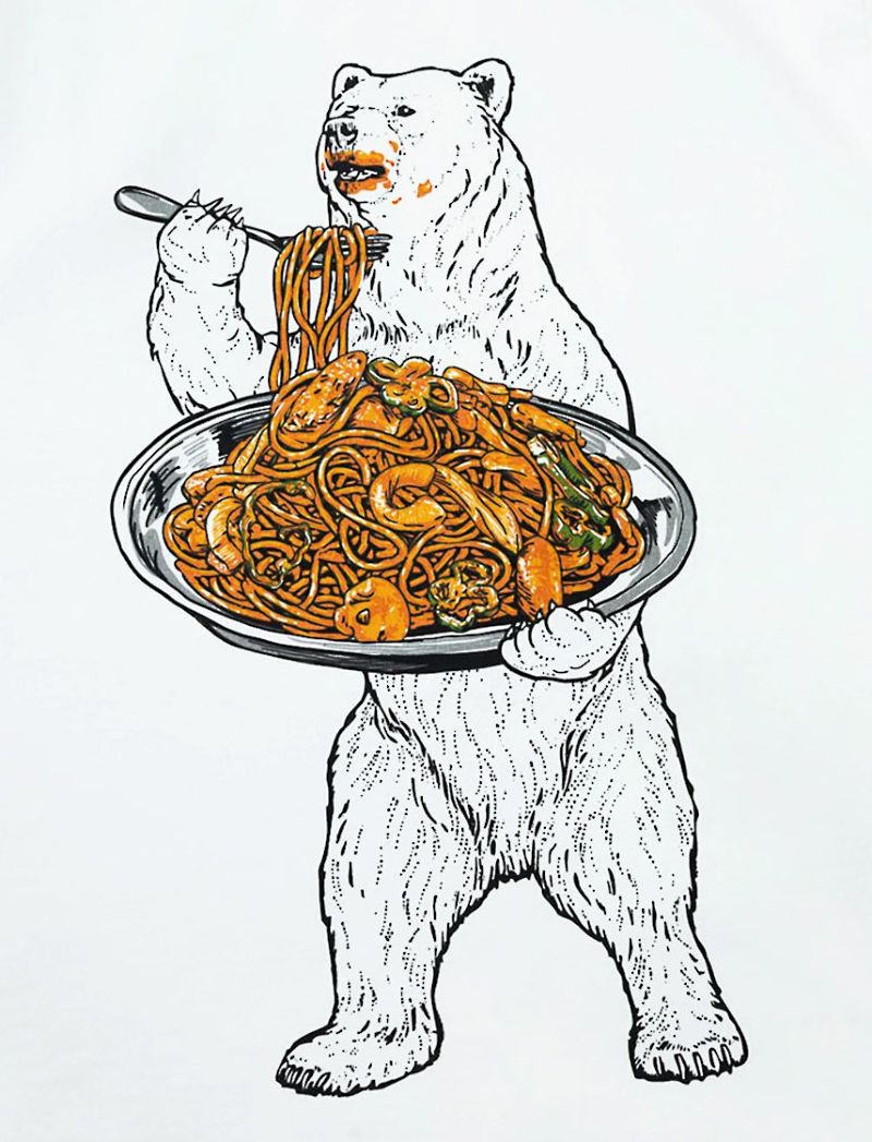 《ナポリタンクマ ロングスリーブ TEE》 昔懐かし昭和喫茶のナポリタンを頬張るわんぱくなクマ。ヘビーなベーシックシルエットのロングスリーブT。バックサイドにはシリーズのオリジナルネームが付いています。