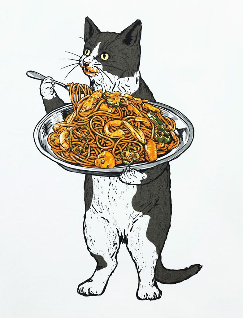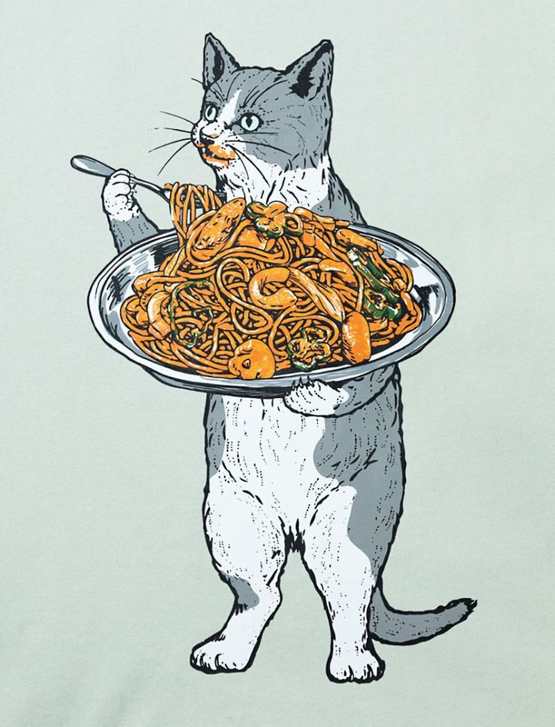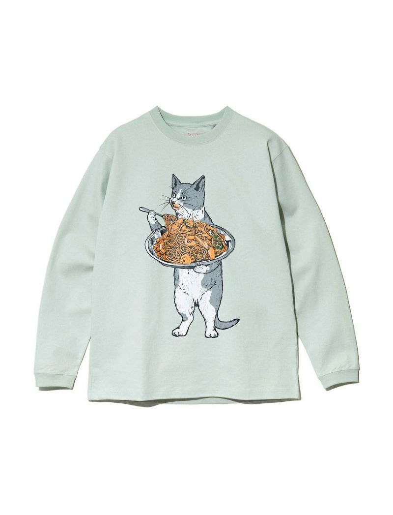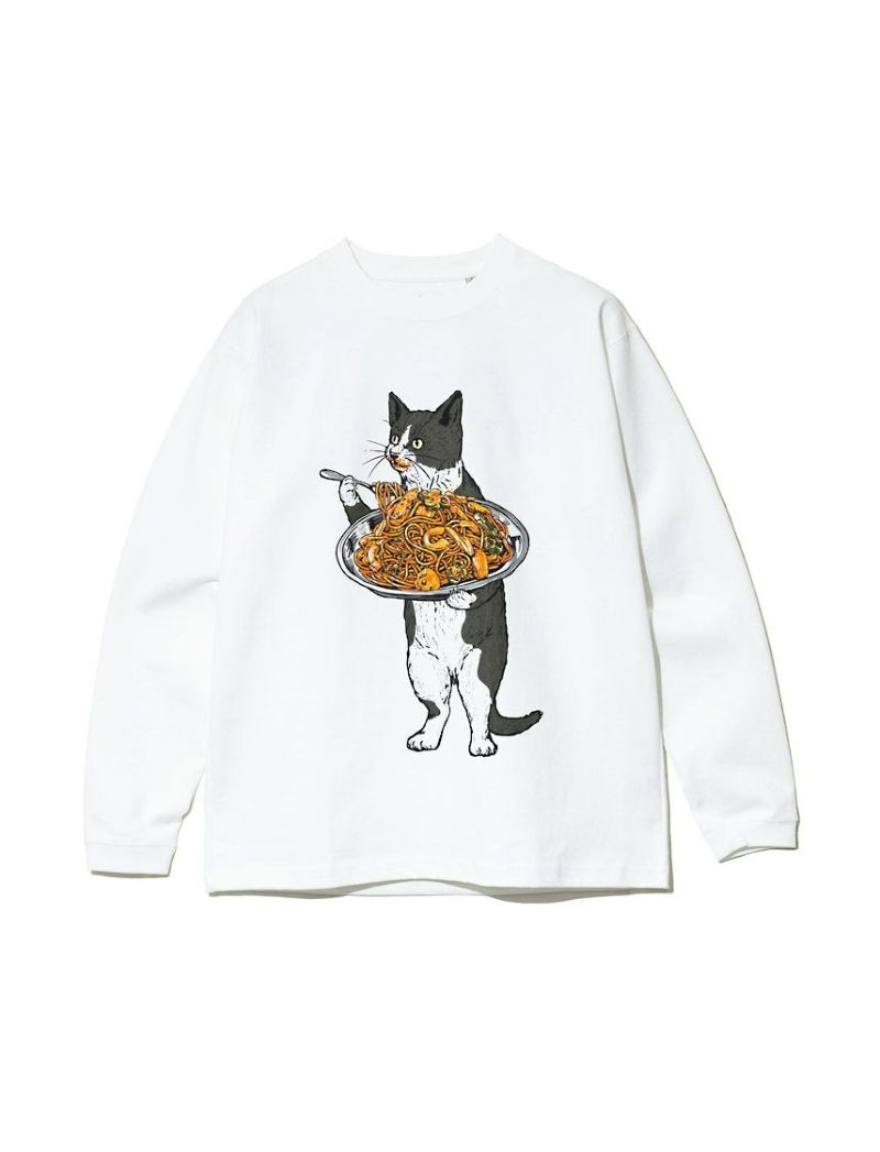 《ナポリタン猫 ロングスリーブ TEE》 昔懐かし昭和喫茶のナポリタンを頬張るわんぱくなハチワレ猫。ヘビーなベーシックシルエットのロングスリーブT。バックサイドにはシリーズのオリジナルネームが付いています。