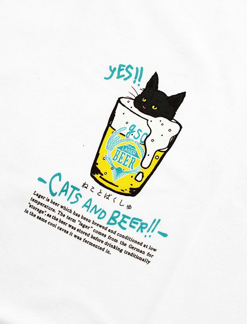 ビールグラスに浸かった猫たちを、バック全体とフロントワンポイントに配置。生地馴染みのいいプリント手法を用いているのでカラフルな発色がインパクト抜群です。猫とビール好きには是非ともゲットしてもらいたい1枚です。