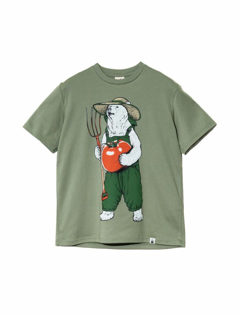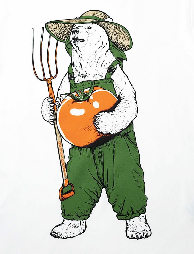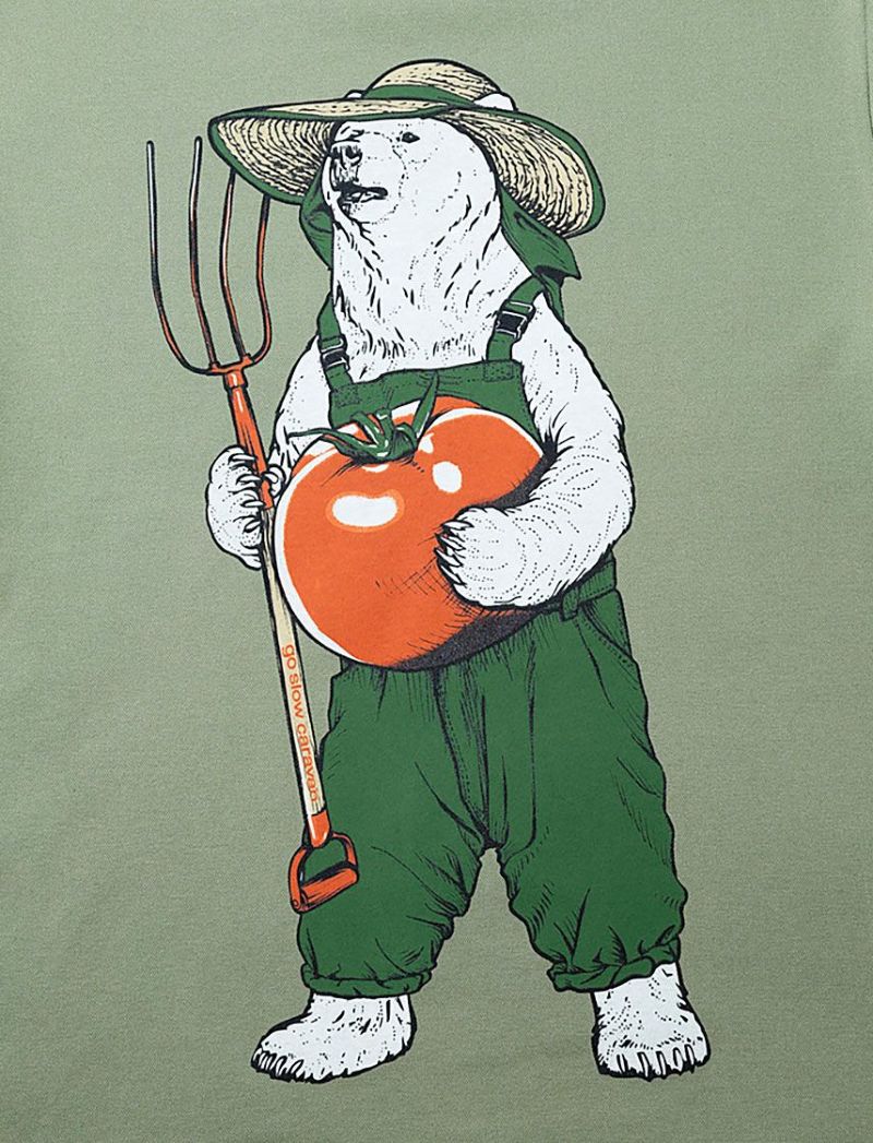 着るだけでテクノロジー体感ができ、地球にもやさしい素材「ピエクレックス」のクマTEE。デザインには使い古した後のピエクレックス素材を堆肥にして育てられるトマトを持った農作業するクマをプリントしました。繊維が動くことで発生する微弱な電気の力で抗菌効果※1 を発揮する素材なので、実際の農作業などの汗をかくシーンでも活躍。ボロボロになったら土に還して循環するアイテムです。